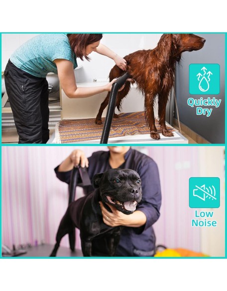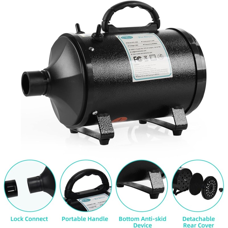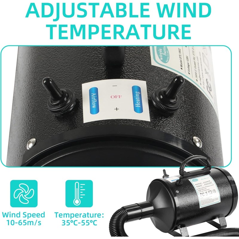 - POWERFUL WIND & ADJUSTABLE SPEED: This professional dog blow dryer is equipped with a powerful and stable motor. Power: 2400W/3.2HP, Voltage: 110V-120V. Stepless adjustable speed, you can choose different wind levels according to the size of your pet, whether it is a small cat or a large dog, the dog blow dryer can dry your pet quickly.